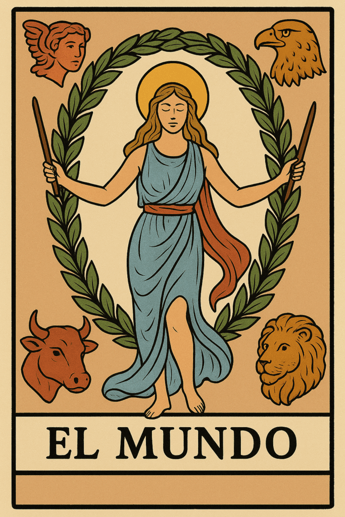 En los mazos tradicionales, El Mundo muestra a una figura danzante rodeada por una corona ovalada —símbolo de plenitud— mientras cuatro seres representan las fuerzas que sostienen la creación.